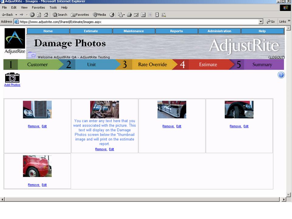 As soon as you Save Changes, the popup window will close and the changes will be reflected on the Damage Photos screen. Note that the text description entered shows below the thumbnail image and will print on the Estimate with Photos report.